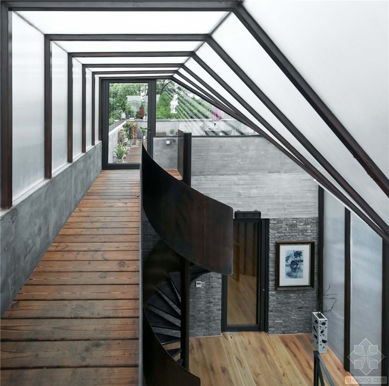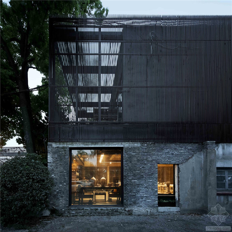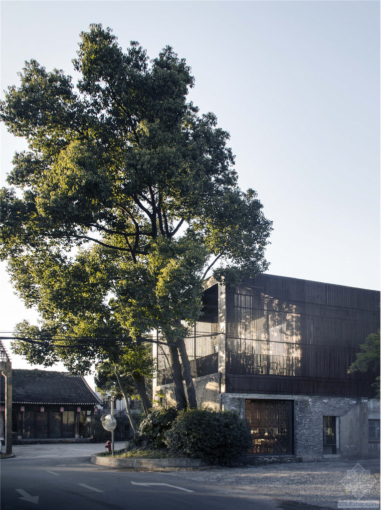 瓷語(yǔ)堂項(xiàng)目是對(duì)建筑原真性的一次回歸,我們希望通過(guò)一個(gè)最簡(jiǎn)單的手段介入場(chǎng)地,使得建筑物僅僅作為一個(gè)“存在”與基地發(fā)生關(guān)系,而不是通過(guò)美學(xué)加以評(píng)判。在面對(duì)場(chǎng)地現(xiàn)狀已經(jīng)存在的幾棟老建筑和一棵大樹(shù),我們希望它們可以成為場(chǎng)地記憶的再現(xiàn),作為新建筑的一部分共同留存下去,而不是簡(jiǎn)單的粗暴拆除并由一個(gè)全新的物體所替代。通過(guò)合理的結(jié)構(gòu)布置和構(gòu)造處理,新房子輕巧的微微落于老墻之上,二者完整的融合在了一起,斑駁的老墻和由磚、木等樸素材料構(gòu)筑的新建筑自然而然的和諧共生,而老墻的歲月留下的痕跡亦為建筑提供了不可復(fù)制的特征。場(chǎng)地上的大樹(shù)成為了我們南側(cè)的重要遮蔽,使得二層的露臺(tái)不會(huì)直接暴露在正對(duì)的一條小路前面,同時(shí)也為露臺(tái)貢獻(xiàn)了不同季節(jié)的多樣風(fēng)景和光影特質(zhì)。作為陶瓷藝術(shù)家展示、交流和工作的場(chǎng)所,空間的布置簡(jiǎn)潔而不失特點(diǎn),混凝土、青磚等樸素而帶有一點(diǎn)點(diǎn)粗糙質(zhì)感的材料與陶瓷藝術(shù)品相映成趣,建筑低調(diào)地成為了作品的背景。
