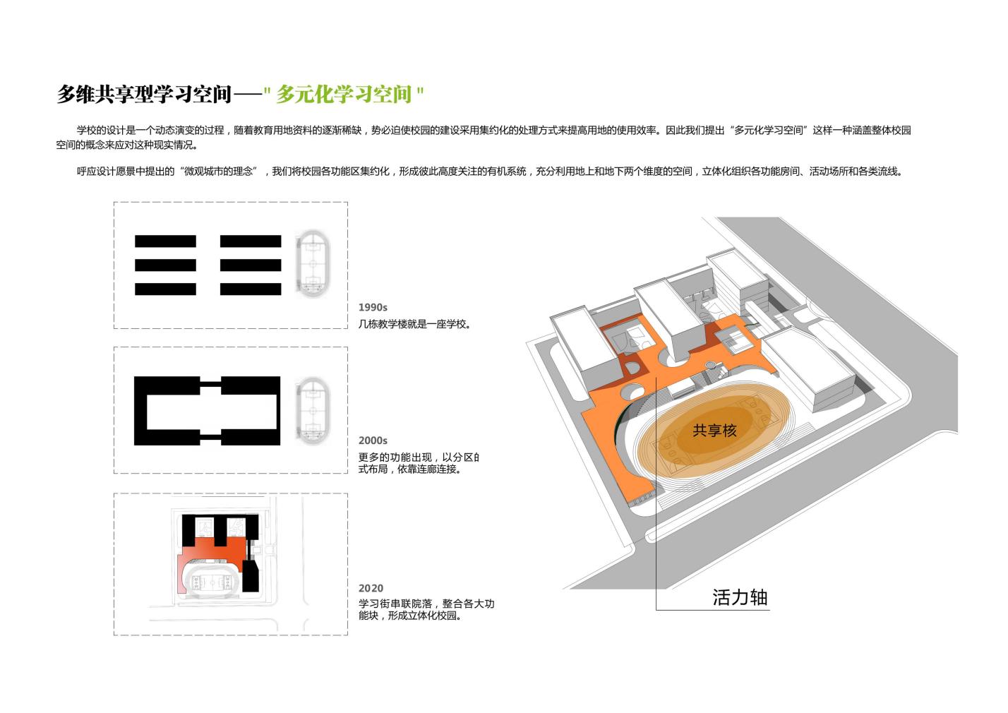 “雙地下”概念是將操場(chǎng)以下的土地進(jìn)行有效利用,將2F綜合樓地下以及操場(chǎng)地下一層作為食堂使用,內(nèi)部包含廚房以及教職工食堂,建筑面積為5460平方,可容納3000人。將食堂的北側(cè)以及西側(cè)設(shè)置6M以上寬的下沉庭院,解決食堂的采光通風(fēng)問(wèn)題,也結(jié)合樓梯踏步與景觀設(shè)計(jì)增加學(xué)生的趣味性。第二個(gè)地下就是學(xué)校西側(cè)地下一層作為教師的內(nèi)部停車庫(kù),可停放200輛車輛,面積為7500平,操場(chǎng)的地下二層設(shè)置地下接送系統(tǒng),作為家長(zhǎng)接送孩子的專用停車庫(kù),可停放160輛車輛,面積為5200平方,內(nèi)部設(shè)置閘機(jī),家長(zhǎng)等候區(qū),閱讀區(qū),學(xué)生刷卡出校后家長(zhǎng)手機(jī)會(huì)接收到短信,便捷的接送到孩子。緩解了學(xué)生上下學(xué)學(xué)校附近的交通壓力。