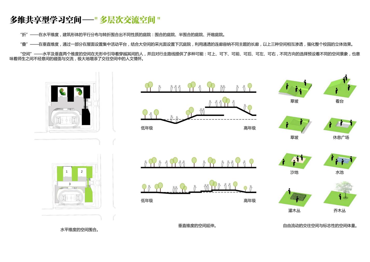 因本學(xué)校規(guī)模的班額較多,土地資源緊張,為了提高用地的使用效率,我們利用了地上以及地下的兩個(gè)空間,提出“雙首層”以及“雙地下”的概念,形成地上雙層以及地下雙層四個(gè)維度的空間,立體化的組織學(xué)校內(nèi)各功能房間,活動(dòng)場(chǎng)所以及各類流線。