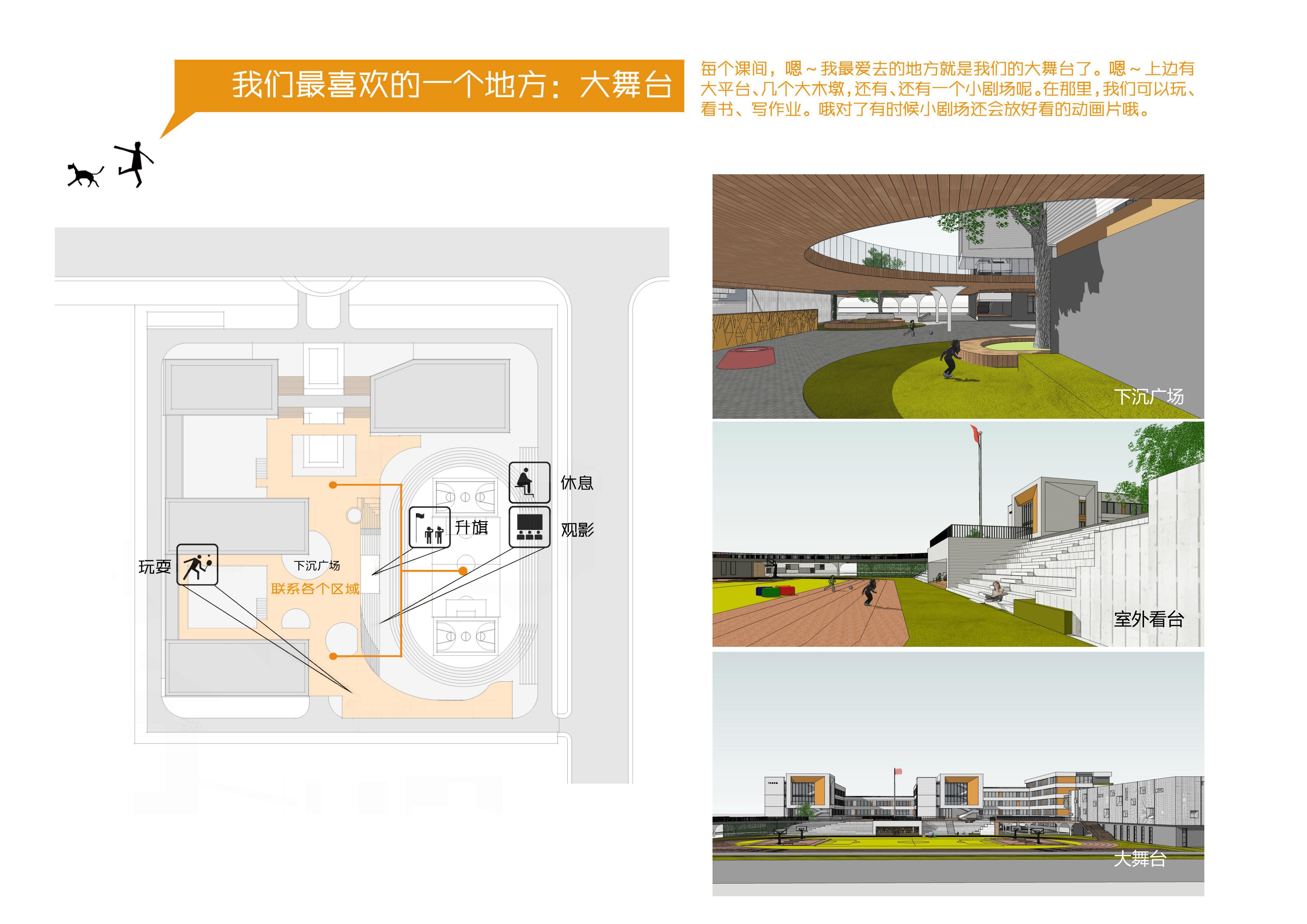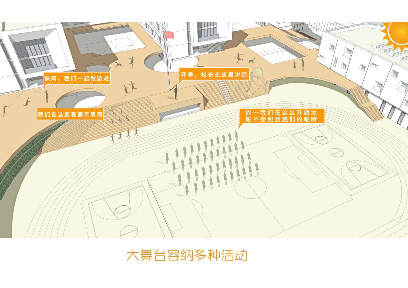 “雙首層”概念是將學(xué)校地上中心部分,局部進(jìn)行一層架空懷抱住操場(chǎng),架空平臺(tái)按照一半面積計(jì)算為1100平方,平臺(tái)上設(shè)置多個(gè)采光井,與景觀設(shè)計(jì)融為一體,形成學(xué)生的二層活動(dòng)空間,與教師增加更多學(xué)習(xí)交流的互動(dòng)空間,平臺(tái)下設(shè)置了功能房間,一個(gè)400平圖書(shū)閱覽室,2個(gè)音樂(lè)教室,1個(gè)舞蹈教室,一個(gè)體育器材室以及公廁。也形成了學(xué)生的一層活動(dòng)空間,這樣解決了學(xué)生多活動(dòng)場(chǎng)地少的難題,也解決了舞蹈音樂(lè)教室對(duì)普通教室教學(xué)引起的噪音污染問(wèn)題。